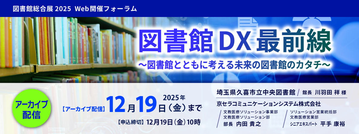 こうした背景を踏まえ、本セミナーでは久喜市立図書館様、KCCSが登壇し、久喜市立図書館で進められている「生成AI蔵書検索システム」実証実験の取り組みをご紹介するとともに、KCCSが提供する最新のDX事例を交えながらパネルディスカッションを行います。図書館様、図書館システムベンダーそれぞれの視点や構想を踏まえ、「未来の図書館のカタチ」について検討してまいります。ぜひお気軽にご参加ください。