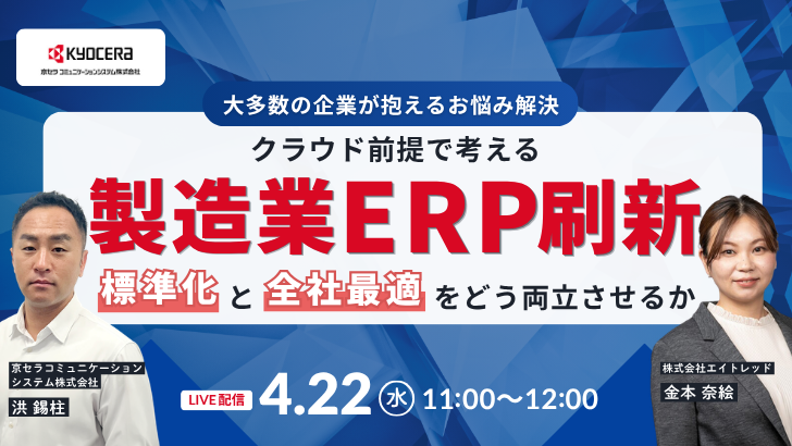受付中 オンライン <大多数の企業が抱えるお悩み解決> クラウド前提で考える、製造業ERP刷新 標準化と全社最適をどう両立させるか 2026年4月22日(水)11:00~12:00 主催:京セラコミュニケーションシステム株式会社 ERP 詳細を見る
