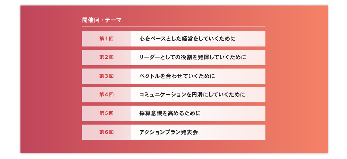 「アメーバ経営研究会」は、アメーバ経営導入法人様向けの人材育成を目的とした教育プログラムです。自社・自部門の経営課題・部門課題を掘り下げ、自社のアメーバ経営のさらなる進化・発展のために各社で研究していただくことを目的としています。
