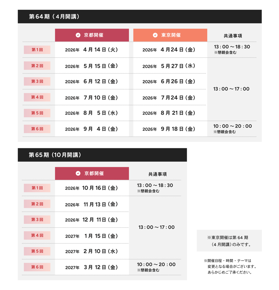 ※ 受講キャンセルについては、初回開催日前日から数えて 7日前までにご連絡をお願いします。それ以降のキャンセルにつきましては、受講料の返金はできかねますので、あらかじめご了承ください。
