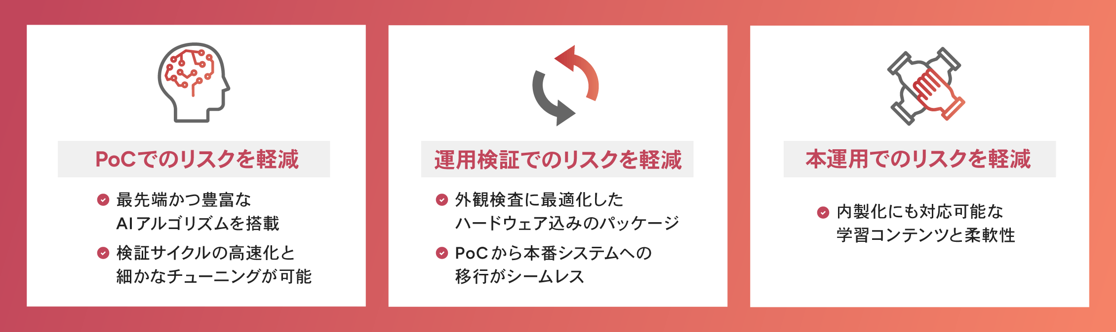 外観検査に最適化されたAI開発ツールとアプライアンスの高度な連携により、AI判定に必要なすべての機能を最適なハードウェアにパッケージ化。AIシステム導入時の投資リスク軽減に貢献します。
